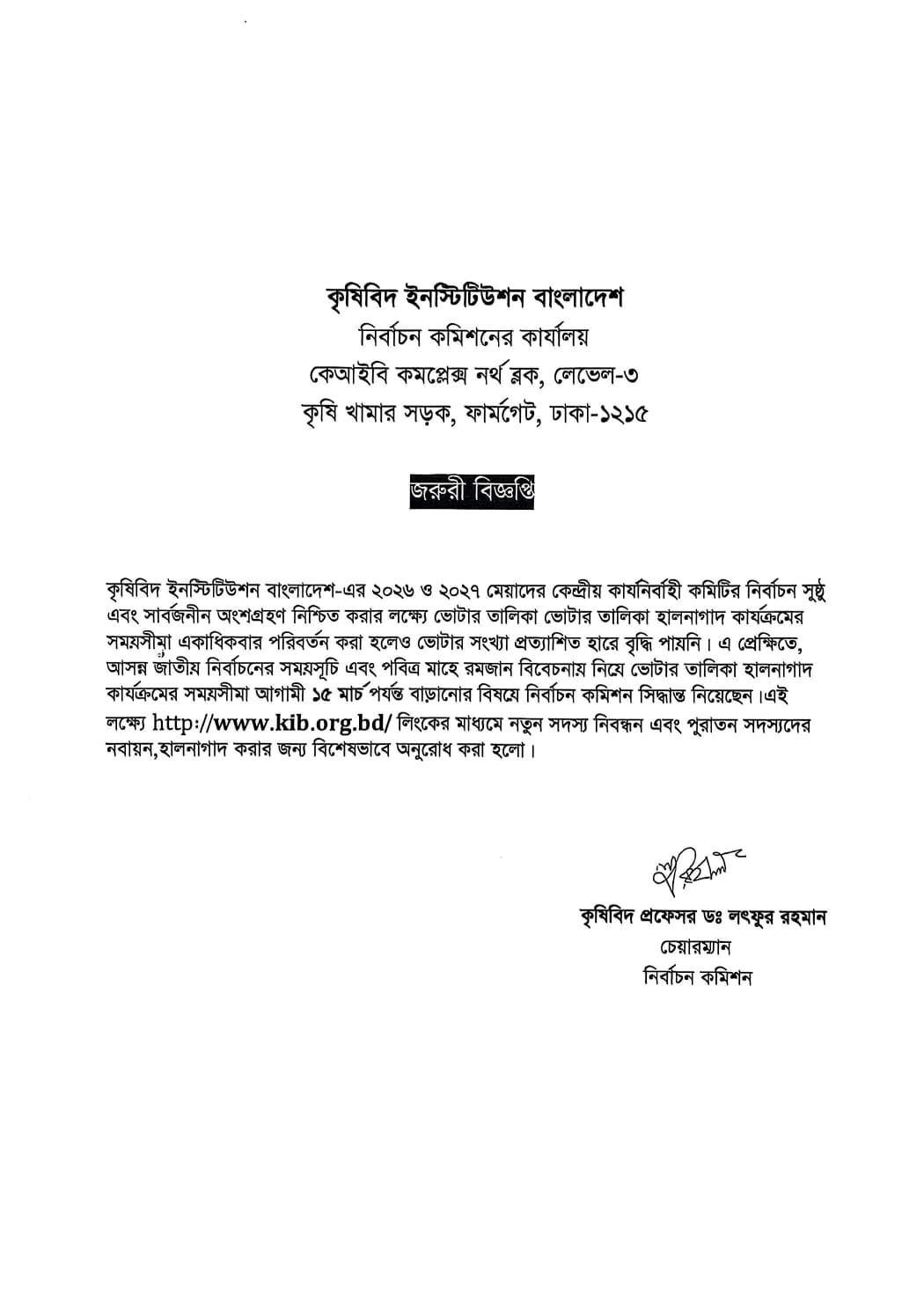 কেআইবি নির্বাচন কমিশনের চেয়ারম্যানের বার্তা-হালনাগাদ মেয়াদ বৃদ্ধি প্রসঙ্গে